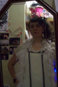 I was up next, decked out in 1920’s style dress, I explained that we were asked to do that – though I like dressing up so wasn’t fussed that not many others actually did it!  I wore a cream dress with matching shoes – not a flapper dress, but a similar ’20s shape.  I also wore my fascinator – any excuse to wear it, as I love it – I got it for my 19th birthday, specially handmade by a Spitalfields Market stall-holder.  I also had a white feather boa – I would have prefered my black one from New York’s Screaming Mimi’s but I can’t find it anywhere – gutted, as it was mega over-priced!