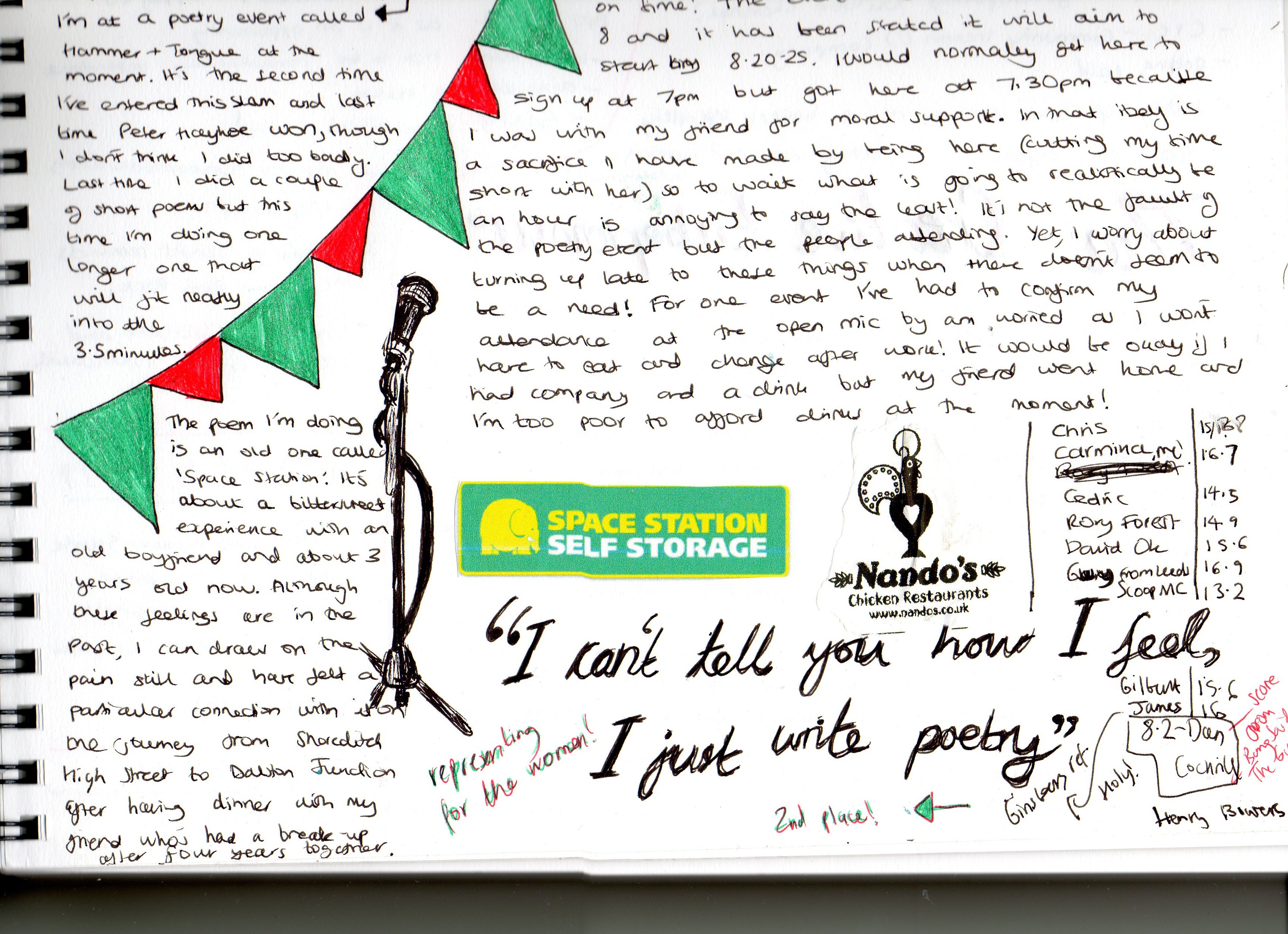 I went to another slam and got a good score but was beaten by a couple of people.  I was feeling a bit messed about by the host beforehand and it rang true that artists are taken advantage of by event runners etc.  I calculated that with around 50 people showing up, charging a fiver-a-head, the artists themselves should really getting paid more than £10 for “travel”.  There are plenty of venues that are free to hire, so it is something that really needs changing.  I was asked… or rather, just told, that I would be the sacrificial poet and then as I accepted this and made my way towards the stage, I was made to look a fool by the host announcing into the microphone that I was actually going to compete in the slam after all and someone else was going up.  I was also told that if I got one of the prizes that cost £5, to put it back… I thought wait a minute, why am I not entitled to get the prize?  Because I asked to be on the guest list?! Come on, poets that compete in the slam shouldn’t even be paying anyway.  I spoke to a couple of men, one of which I had met a couple of times before, and he has expressed the event is ‘for poets’ rather than ‘for everyone’ so maybe that’s part of the problem as to why the slammers also have to pay.  Also!  Some of the features hardly had five minutes!  It should be 10 minutes minimum really, I reckon.