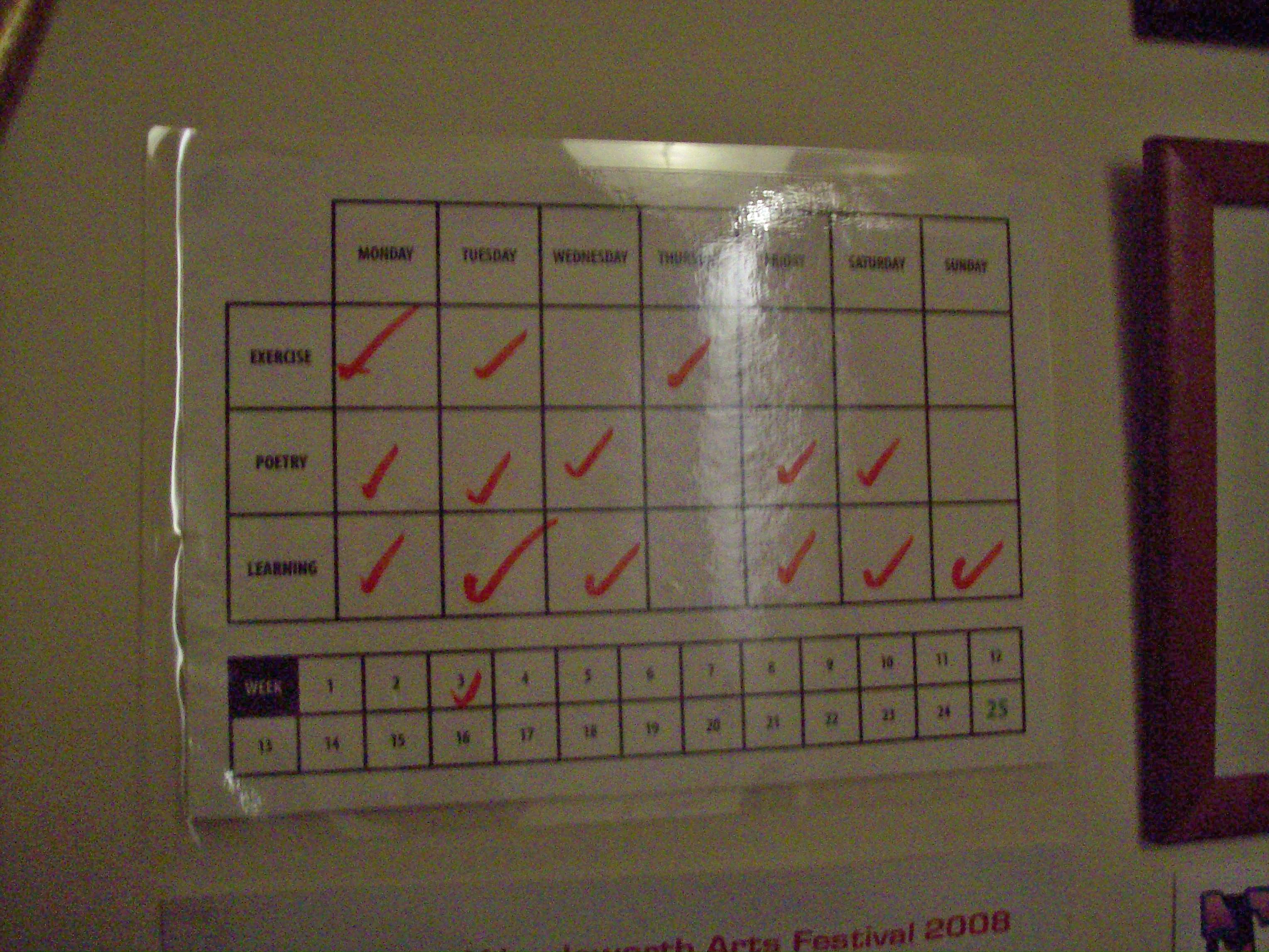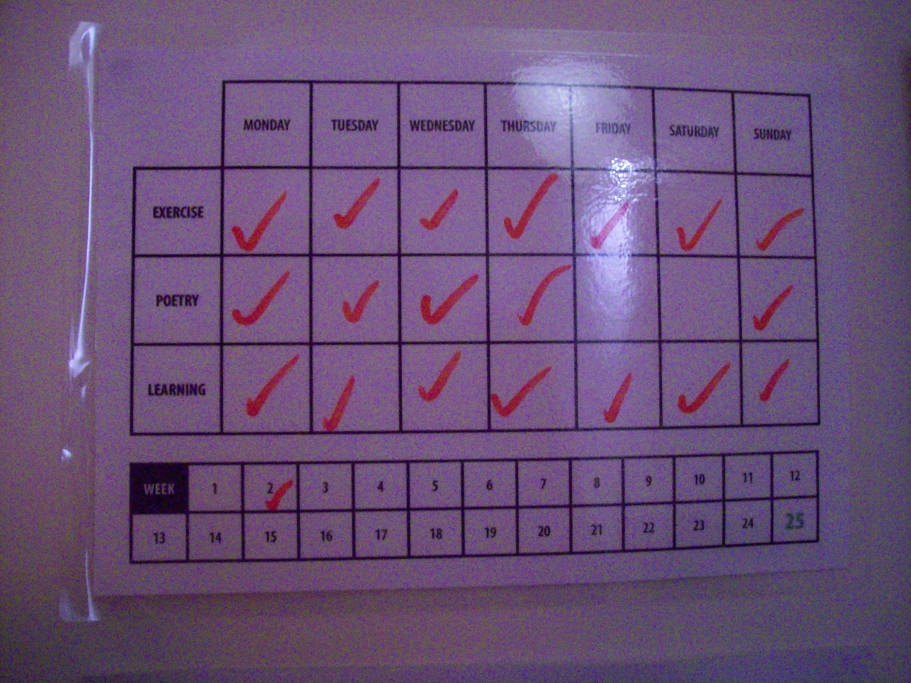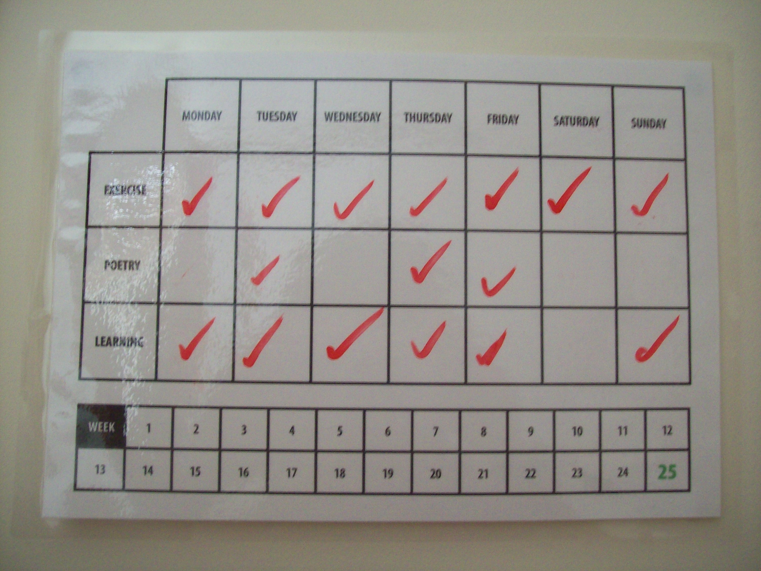 Matt made me these cool timetables that you can draw and wipe off.  It’s really good because it gets your mind focused and you feel good ticking things off.  I’ve missed a few things off but I think I’m doing pretty well!  I wonder if I can count my Sainsbury’s work as exercise since it’s manual? Hmmm!