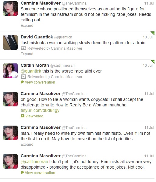 Feminist Society) were confused about this dialogue from the onset. Admittedly, I then received a lot of mixed views about the intentions here. On one big hand there is the simple fact that the initial comment had nothing to do with rape at all. This begs the question, why would a comedian (and a Feminist comedian at that) make it about rape? With the continuation of the joke, it makes an obvious comment on the excuses some rapists can make, along the lines of a woman “asking for it” because she’s perhaps allowed things to go as far as kissing or foreplay. Still, I was confused about the intention of the initiation of this dialogue, and thought it was problematic that someone hailed as a modern Feminist icon in Britain should be making light of rape whatever the intention. Someone from the UEA FemSoc group stated that “Jokes about rape culture – any oppressive system – can be used to mock and destabilise rape culture. Jokes at the expense of victims undermine VICTIMS” and this struck a chord with me – if that was Moran’s intention. I also saw this Twitter convo: