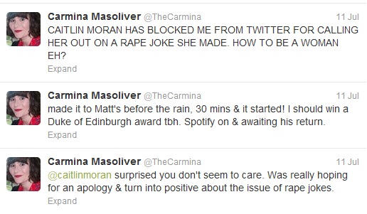 Okay, I can admit that I have come round to thinking that Moran’s intention was to mock and destabilise rape culture, however, what I am unhappy about is how the lady herself dealt with the whole situation. She immediately blocked anyone (including me) who called her out on the joke on Twitter. The only comments I saw were things like “I’m going to have to sit on this chair for a while, and feel sad. about the world.” They came across as really sarcastic and like she didn’t really give two shits. All I wanted (along with a lot of her fans) was for her to explain her intentions and defend her actions. Although I’m still not sure that making a joke about rape whatever the intention is the best thing to do for someone that many girls now see as an authority figure on Feminism, but I am willing to debate it as I can definitely see how it can help dismantle rape culture. However, the way Moran dealt with it was rude and immature, and just really disappointing for a lot of fans, who were willing to listen to what she had to say and would have liked her to use the opportunity to open a discussion on the subject. At the moment this is a crucial issue since the release of this statement about Daniel Tosh. It would have been great to get Moran’s opinion on rape jokes in the comedy scene. For the record, this is what I wrote on Twitter that got me blocked: