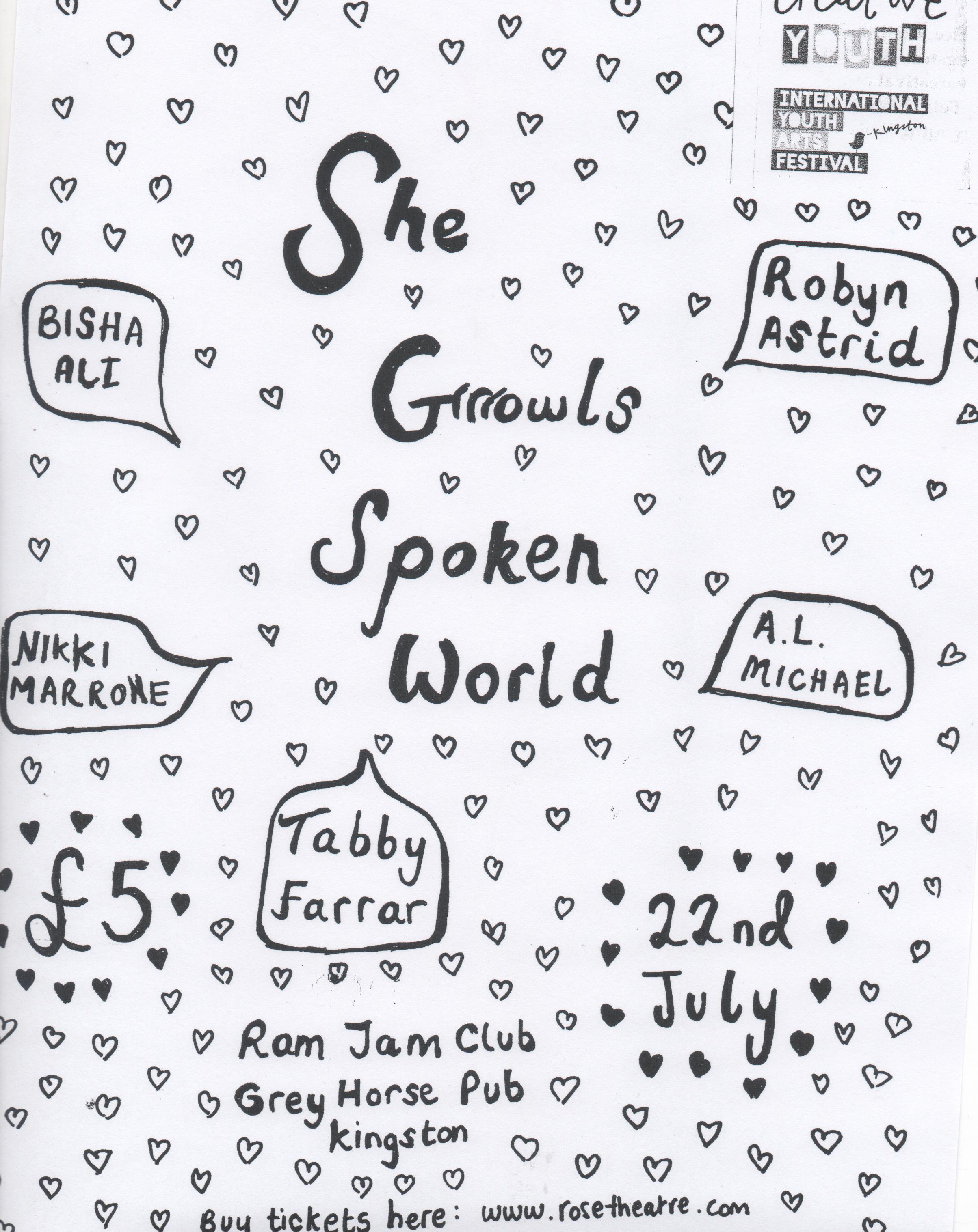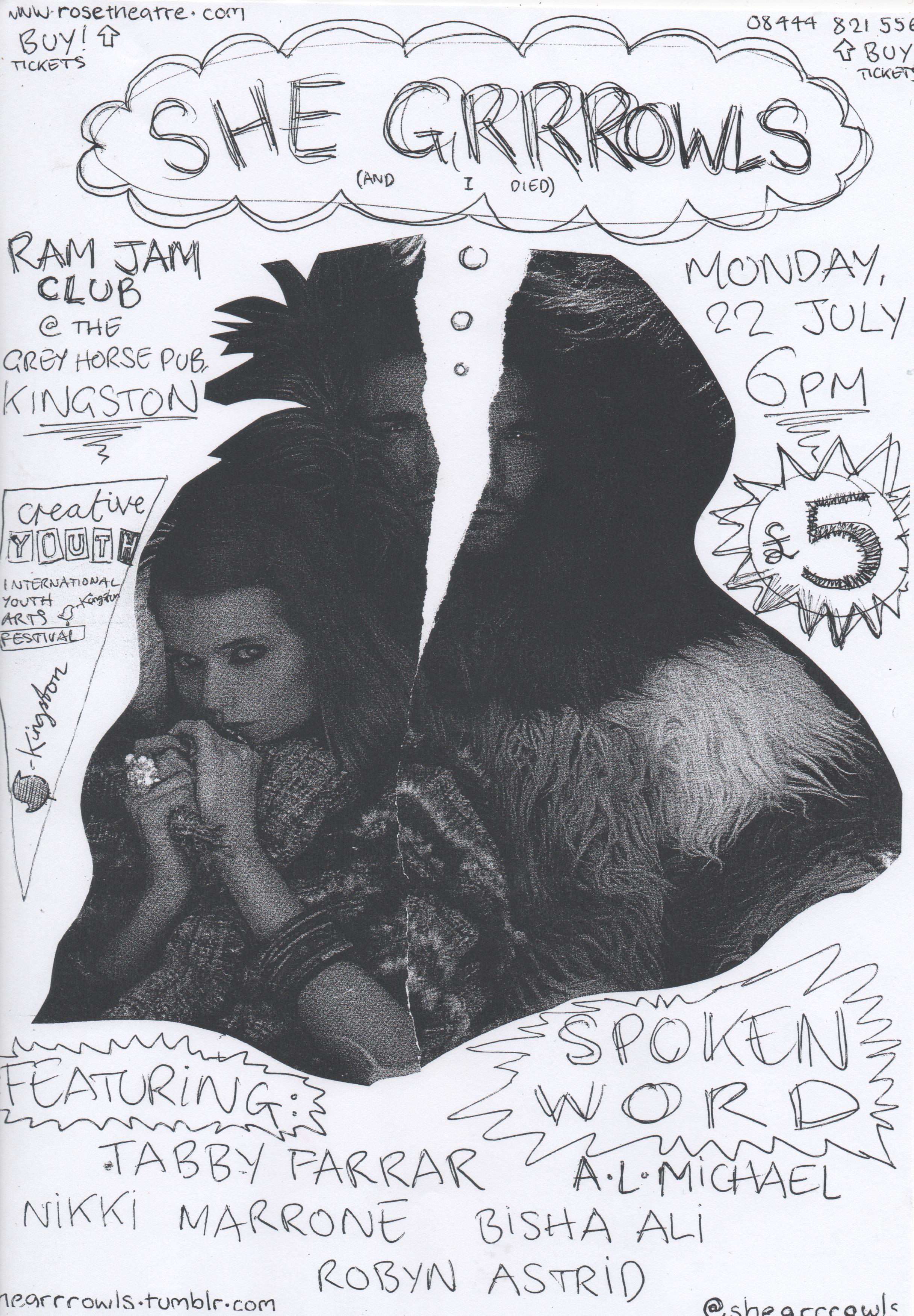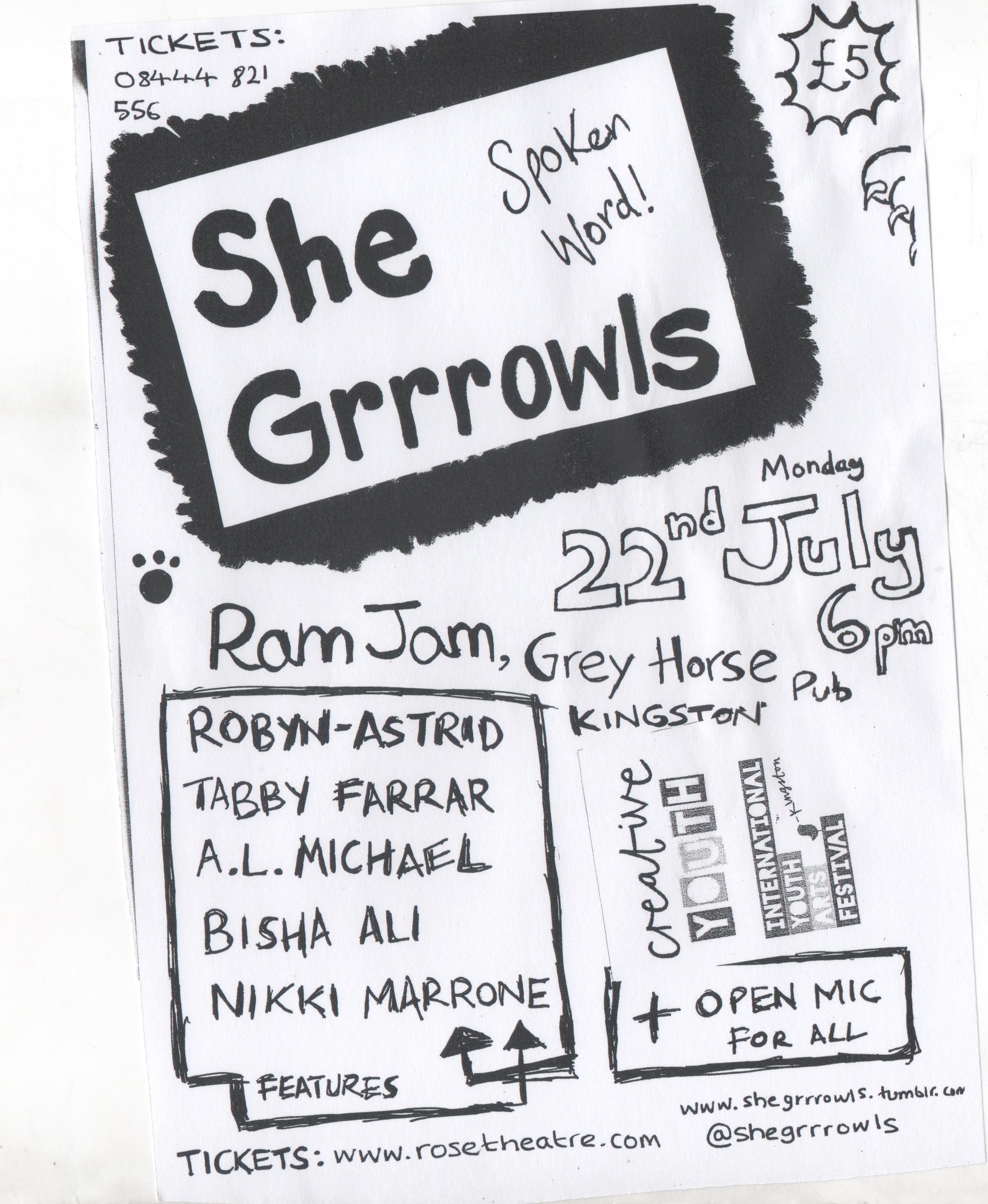 International Youth Arts Festival 22nd July – She Grrrowls pilot event, 7pm, Ram Jam/The Grey Horse, Kingston. £5 entry. 6th July – Workshop from 6pm, with readings and food and drink from 7pm at Las Iguanas, Kingston. £10 adults, £5 OAP, students,