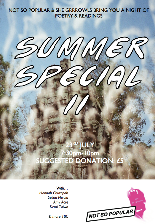 On my return I will be collaborating with Not So Popular on the next She Grrrowls event at Blessings in Shoreditch on Wednesday 23rd July. We have Hannah ChutzpahSelina NwuluAmy AcreKemi Taiwo, Prudence Chamberlain, Eley Williams and more.
