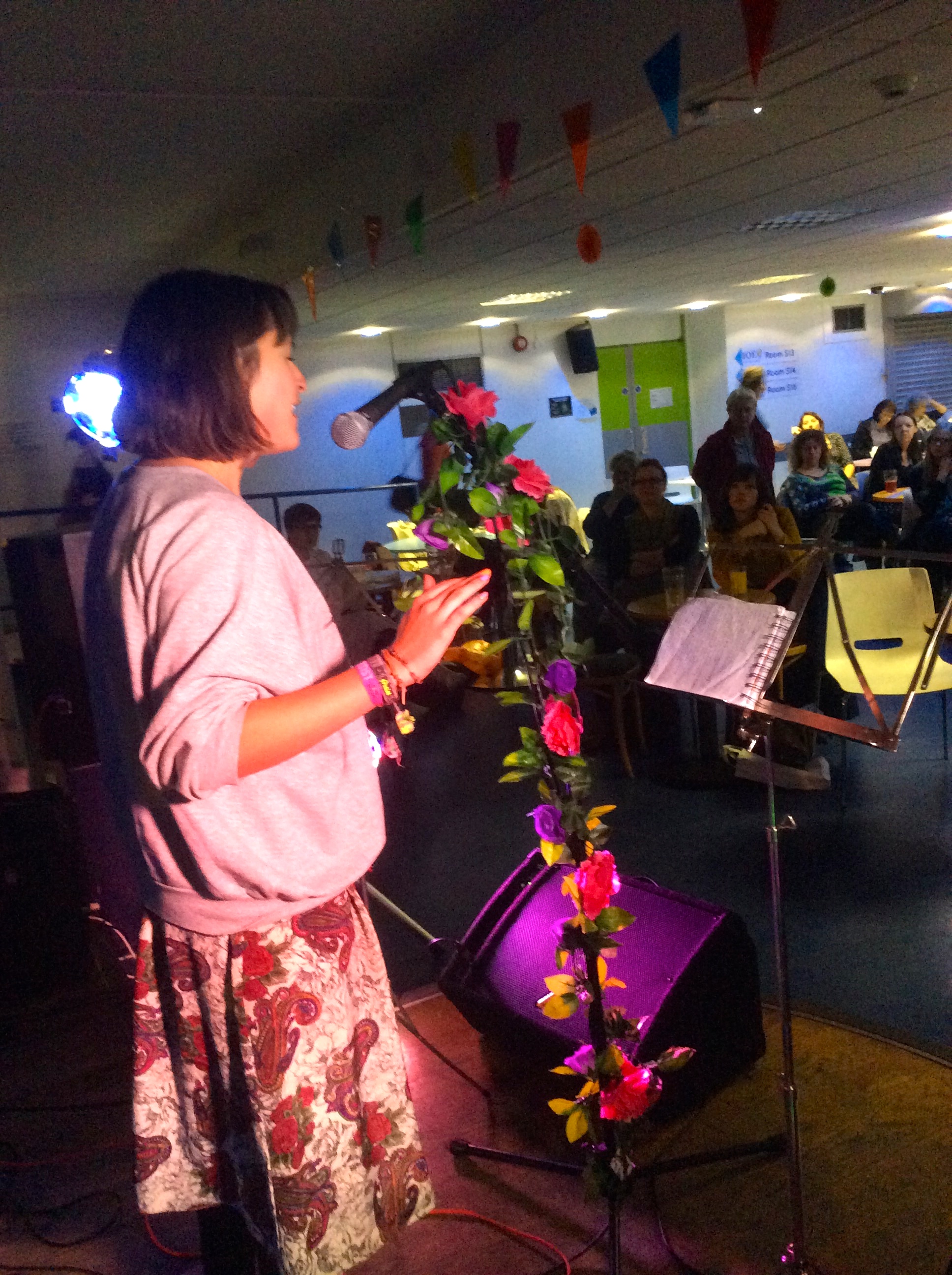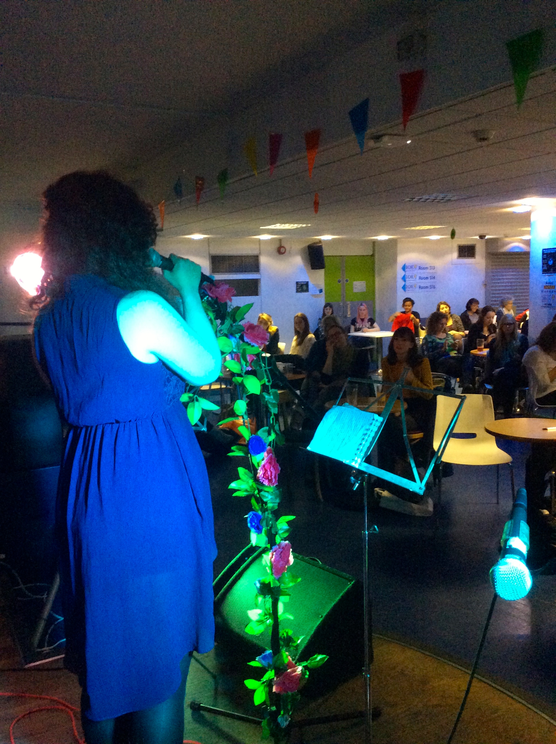 After the conference, we headed to the SU bar for the after party. I was joined by Rose Swainston and Maeve Scullion (pictured above) to represent Kid Glove. Kate Smurthwaite was also featuring; I mentioned something I found problematic in my earlier post, but other than that, she was the performer I most enjoyed that evening. I also enjoyed the other poetry act, Mabel, and the women who sang Spanish and English songs on her guitar. I felt proud after knowing ‘mujer’ meant ‘woman’ (sadly, due to Duo Lingo, not my Spanish heritage). Without wanting to dwell on negatives, I was really taken aback by a woman who, after a poem on personal experience of a rape-joke, called out ‘I’m not clapping to that, it was awful.’ And soon after, said to another woman ‘are we going?’ She was very near the stage and she didn’t try to hide what she was saying – quite the opposite. I felt close to tears, but as we were rotating poems between the three of us, I had to put it to the back of my mind and tell myself she must not have understood the poem. I stayed for a bit of the Stepney Sisters, but left early as I was tired and had a long journey to go back to the suburbs. I’m already looking forward to next year’s conference and wonder where I will be on the journey of Feminism then.