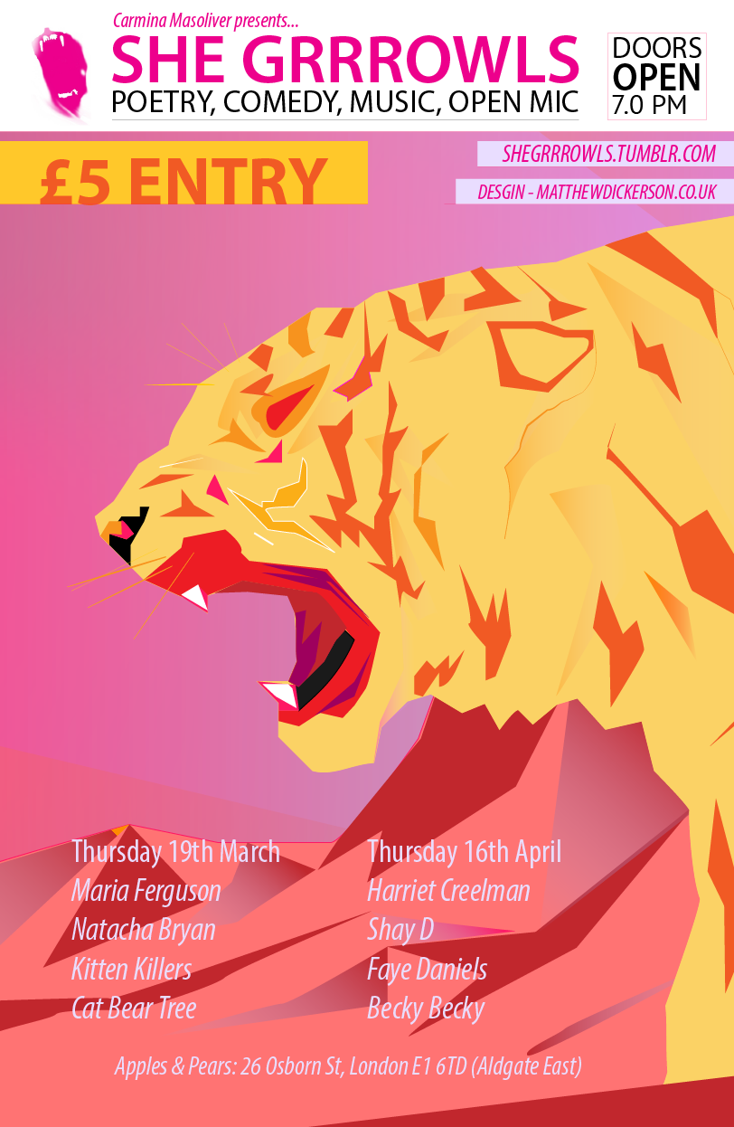 Lastly, make a note in your diaries for the next She Grrrowls event, taking place at Apples & Pears on Thursday 19th March. It will feature Maria Ferguson, Natacha Bryan, Kitten Killers and Cat Bear Tree. Join the event here. Please support these next two events – if we get a good turn out we will be able to confirm the next few months.