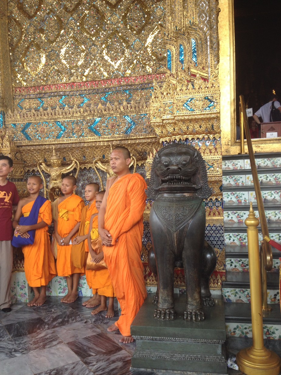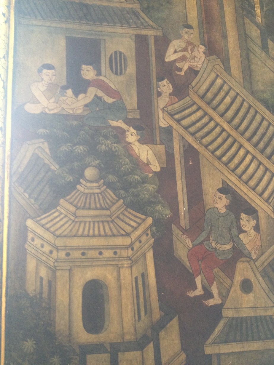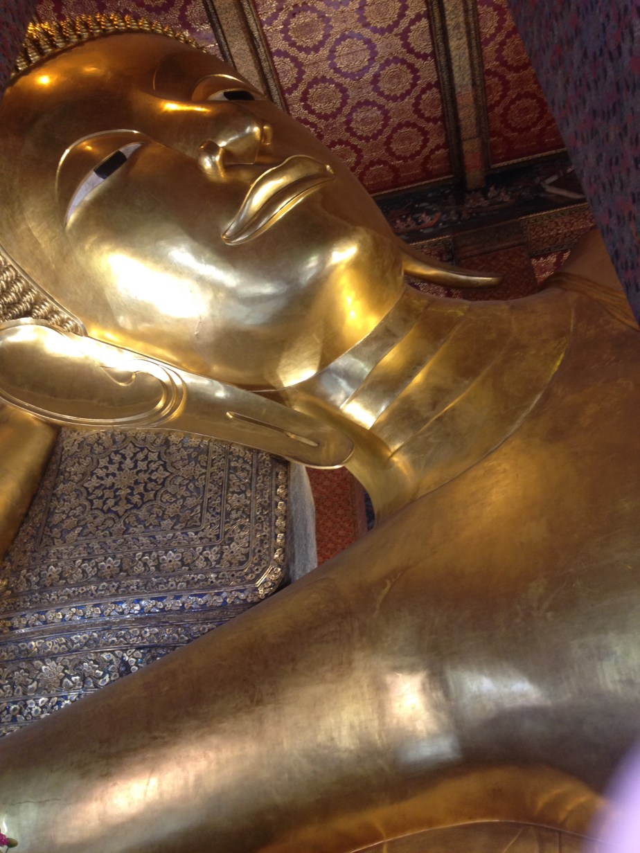 In Wat Pho, we felt the welcome relief of the fans throughout the building, but also wonderment at the giant golden Buddha casually reclining before us. You were able to walk around the whole statue, and see the walls covered with visual stories. A thought flickered across my mind — the women in these pictures, and sometimes men, wore garments covering one shoulder, often exposing the fleshy curves of their breasts. I laughed to myself that there were visual depictions of exactly what you were forbidden to wear in the temple. We walked around the grounds, where it was just as beautifully constructed, and contained a man-made waterfall, and pond of fish, as well as places for worship.