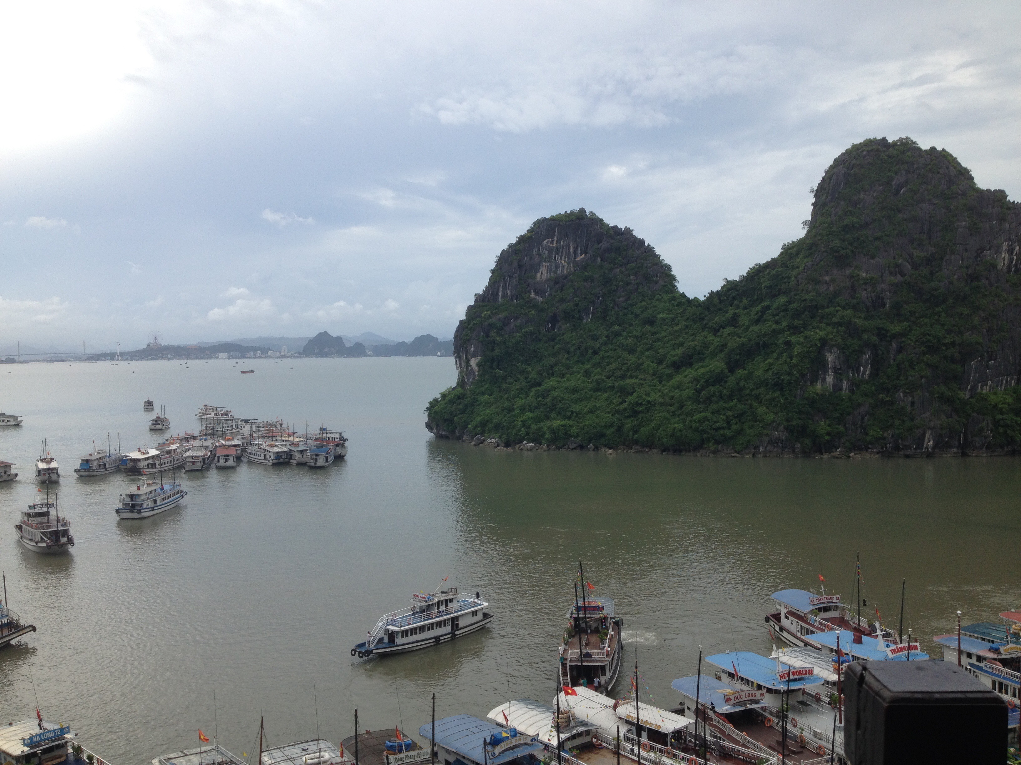 For the five year anniversary of being with my partner, we decided to go to Halong Bay. We had a relatively early start and got a taxi to Lac Long bus station, and the journey took about an hour an a half from there. We took a taxi to our hotel and managed to check in around midday. The weather was forecast to be thunderstorms, but we were relatively lucky with some light rain and overcast. Being Vietnam in July, it was still hot.