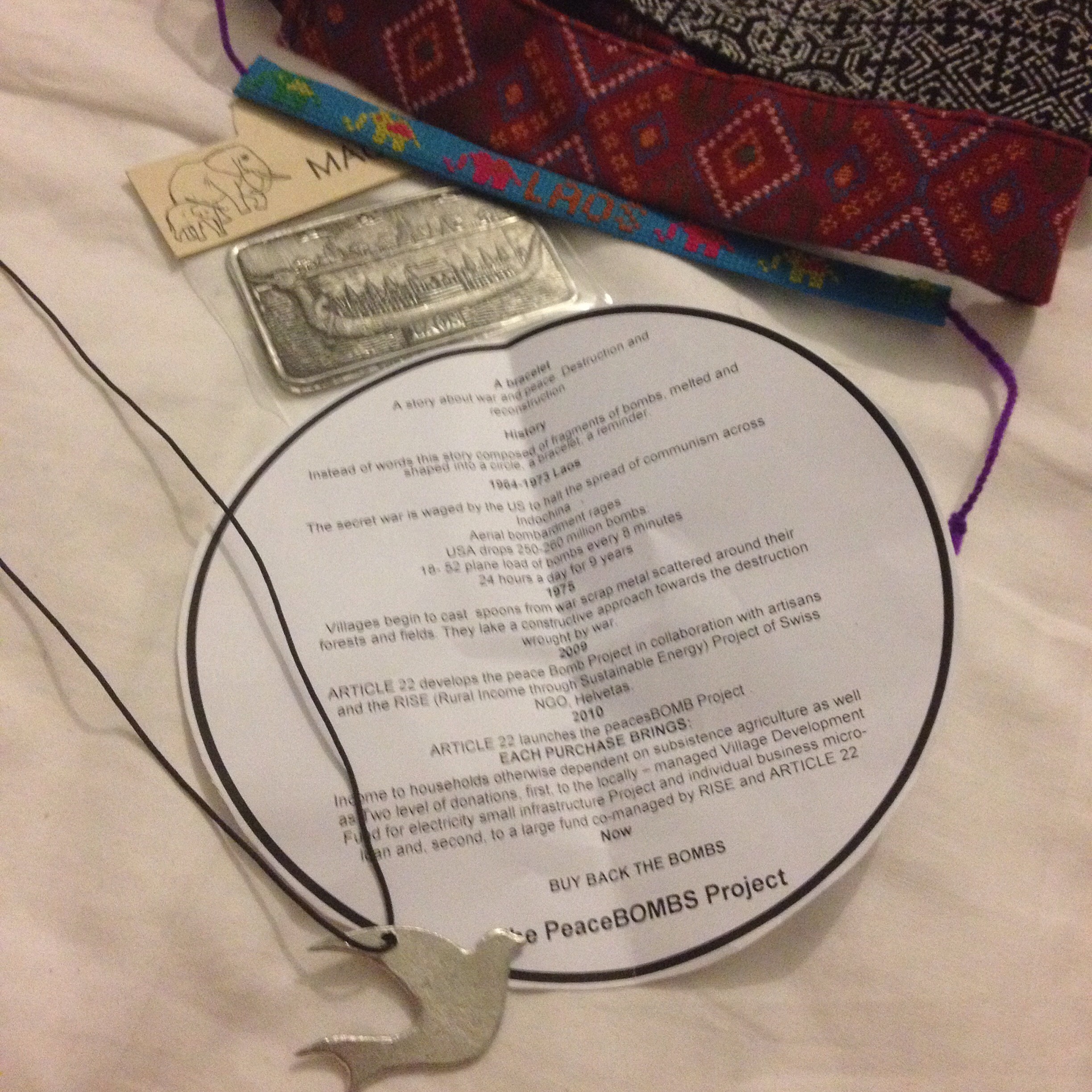 That afternoon and evening we ate street food – crepes, fruit drinks, rice boxes and spring rolls. Laos has not disappointed on that front… Other than the meal we got with our bus ride today! We spent the evening at the night market and picked up a few souvenirs, one of which was a necklace made from aluminium from old bombs. One of the most important things to remember is that this country was bombed by the US more times than every country combined in the Second World War. The US have spent less money helping to clear the undetonated bombs than they did putting them there, and there are still 100 people who are injured or killed by these bombs each year, a lot of these people being children. I wanted to get this as a reminder, as well as to carry a message of peace.