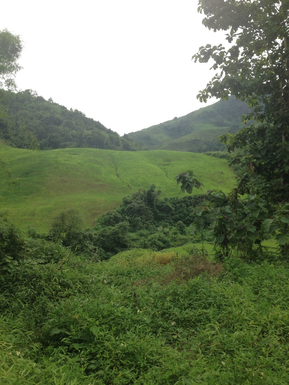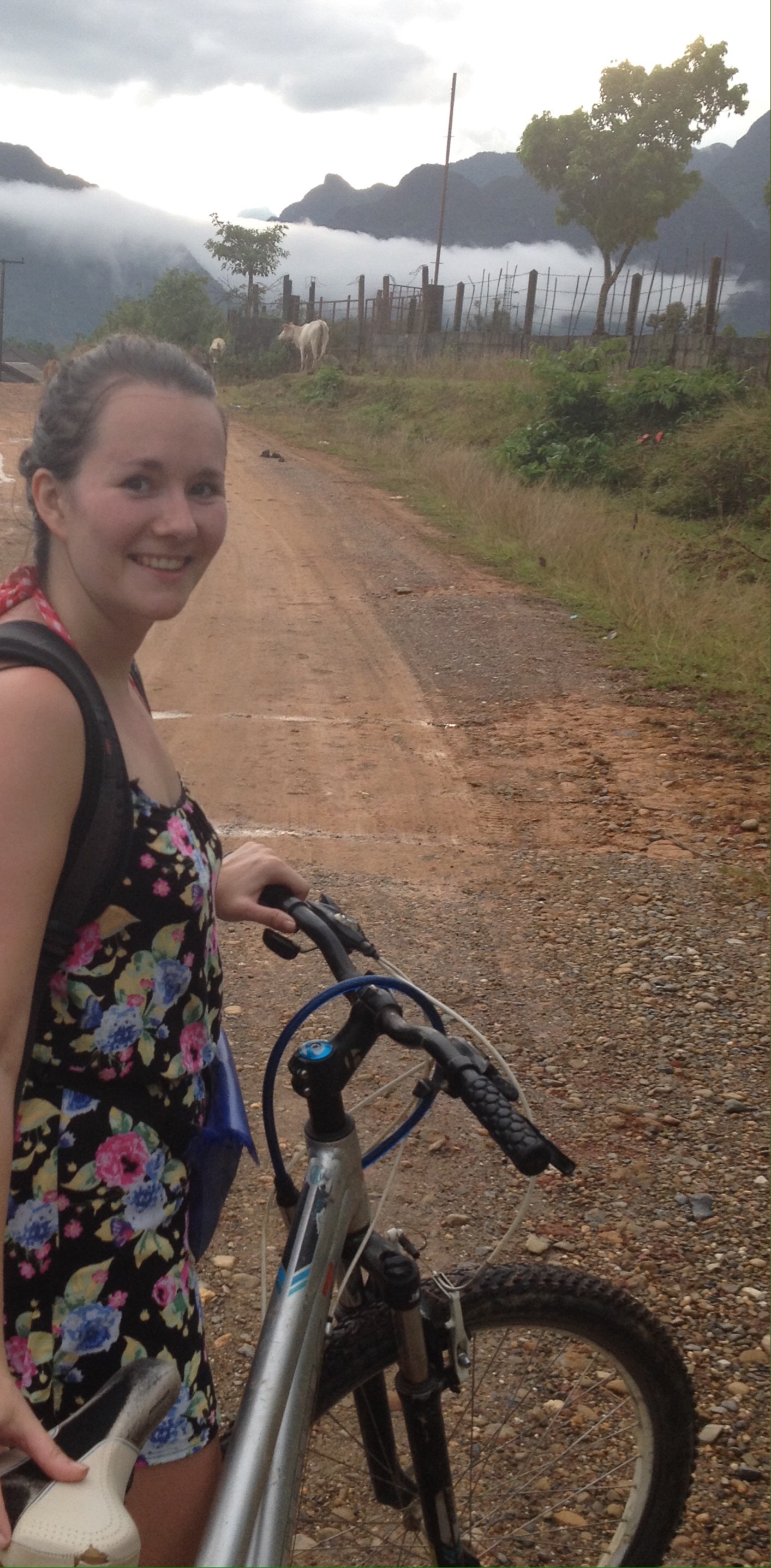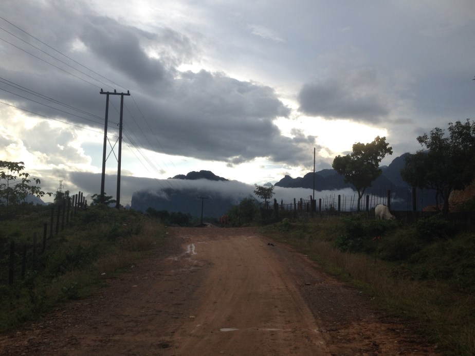 We hired bikes afterwards, once I realised I had a photocopy of my passport that one place took – you need it as a despot to do basically anything, but I’d read that it was dodgy to do this, so wanted to avoid it… plus, we had forgotten our passports and Organic Farm is a 45minute walk, which we had just travelled for the purpose of hiring bikes. Anyway, it was the first time I had ridden a bicycle since I was at least eleven years old, so about 15/16 years ago! It’s true what they say… I was able to do it all right, though my bum ached (and still does). Even in the rain I loved it. I felt like a child again, getting wet and not caring. In this rain, you would also see Lao children playing, naked in the street. In fact, on our journey down there were a few kids slipping and sliding in the rain. We dried off and changed before heading out again. Luckily, the rain stopped, but we tried to go to the waterfall and failed to make it before we had to return the bikes, but it was worth it for the scenery alone.