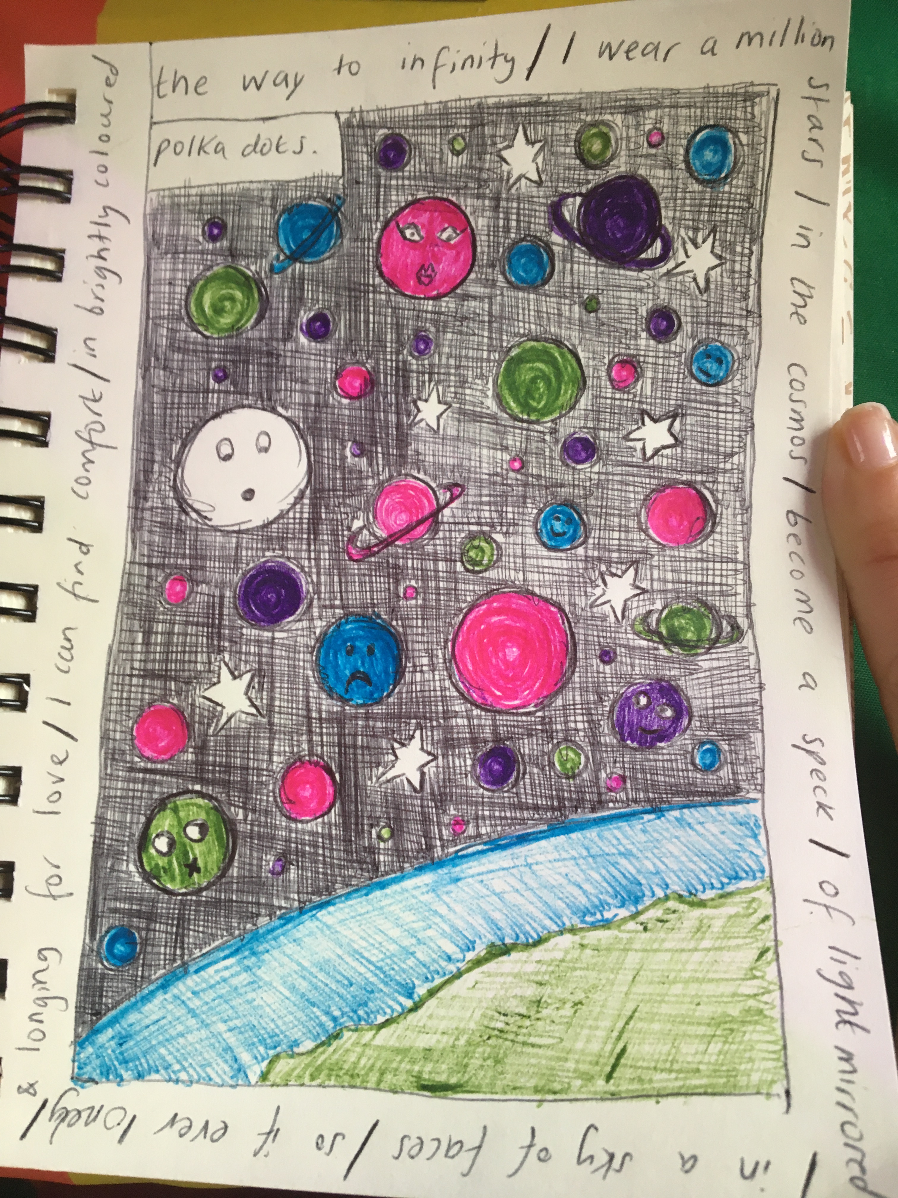 I’m working seven days in a row this week due to holding stalls last Sunday (pictured), where I sold just one book, and two badges… and tomorrow I’ll be at Camberwell Green’s Farmer’s Market, which is fantastic as they invite one artist a week to have a free table! The other ones were SoLo Craft Fair and I paid £60 a pop, plus the very specific and expensive insurance. Help! I spent the time writing my journal, studying Spanish and Turkish (the latter subject really hurt my head), and then spent the last hour doing this doodle. Time well spent, I suppose…