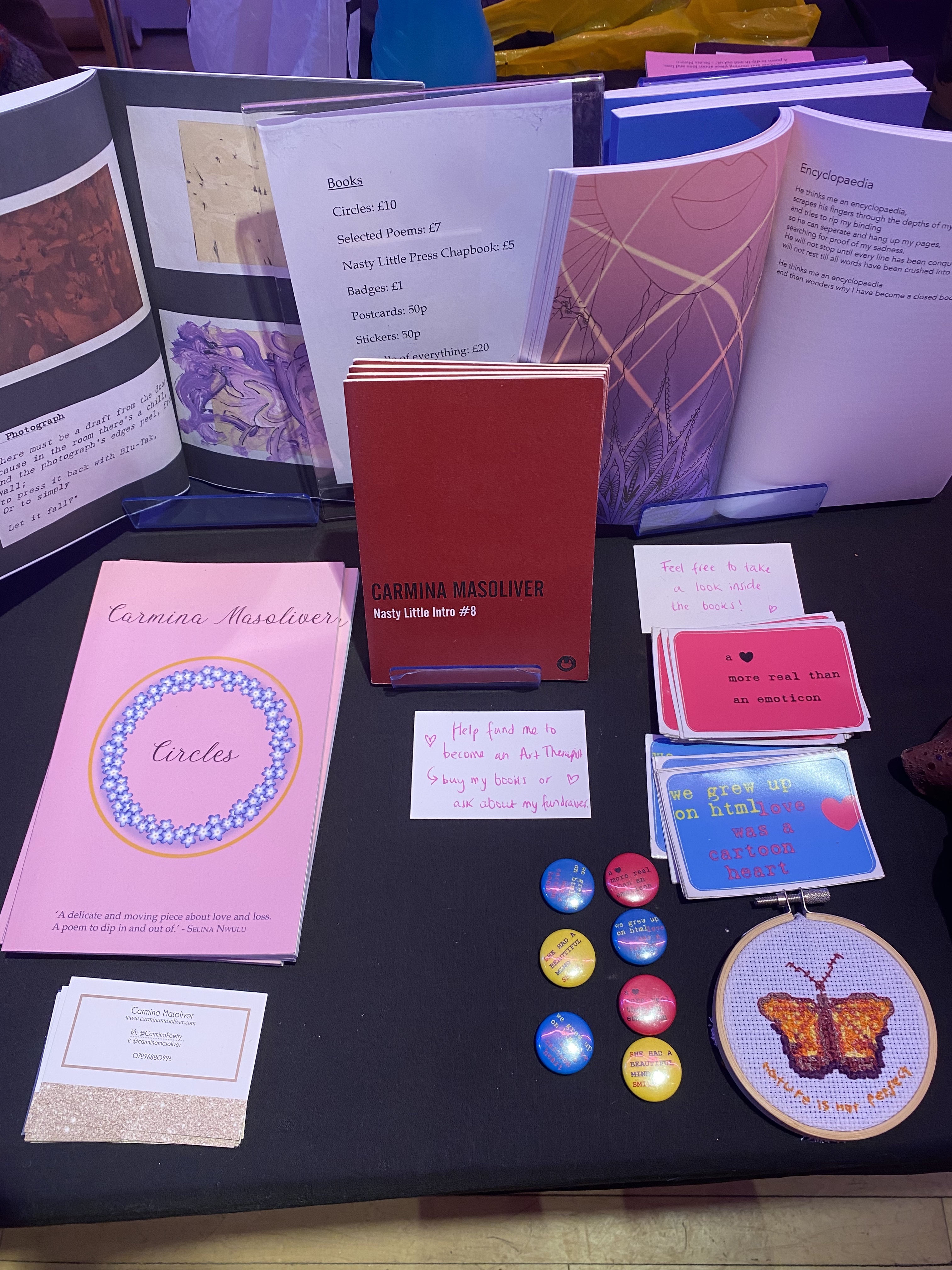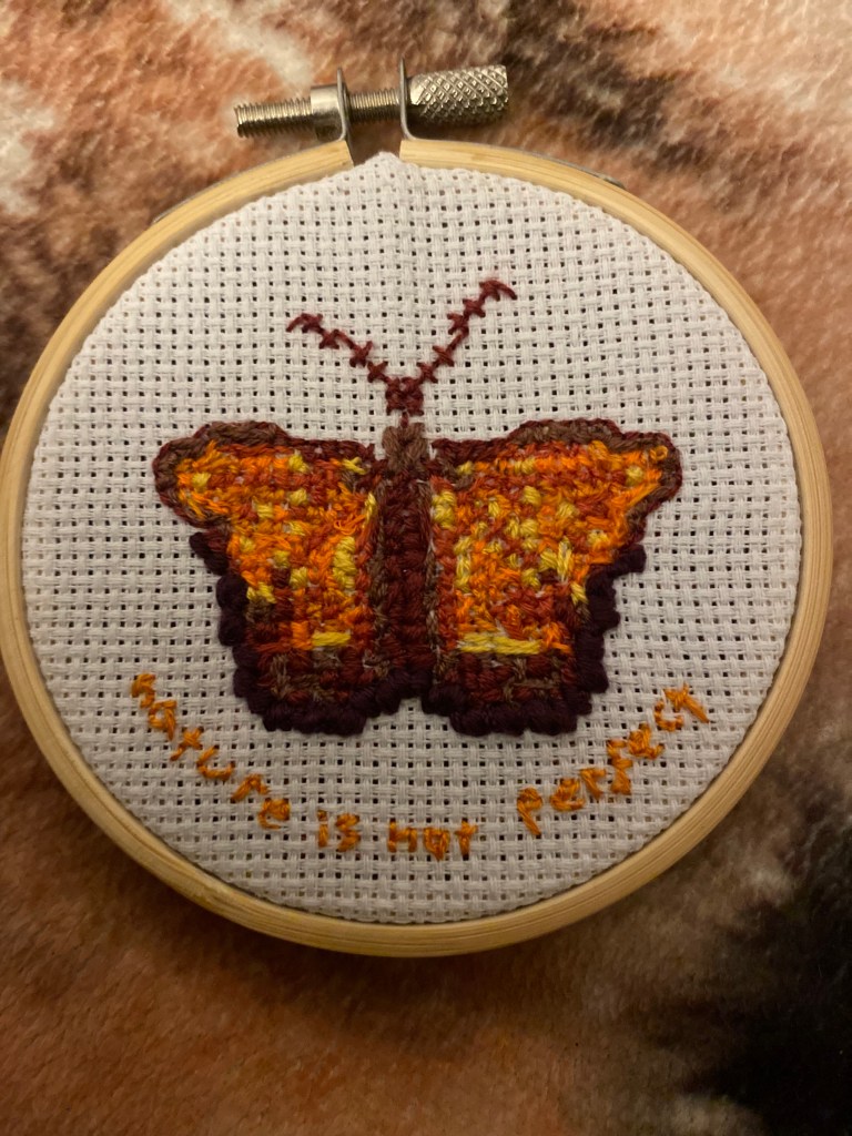 Last Sunday one of my fellow Art Therapist trainees offered me to join them and do a stall. It was indoors, thankfully, as it was chucking it down outside. It was only a little chilly from the doors, with lots of people coming and going, but Emily helped keep us keep warm with some delicious chai. I had recently finished my butterfly, and added text: ‘nature is not perfect’ to it. I didn’t make any sales, which is always disappointing, but the organisers only charged £10 a table and Emily let me join her for free, so I’ve made bigger losses in the past!