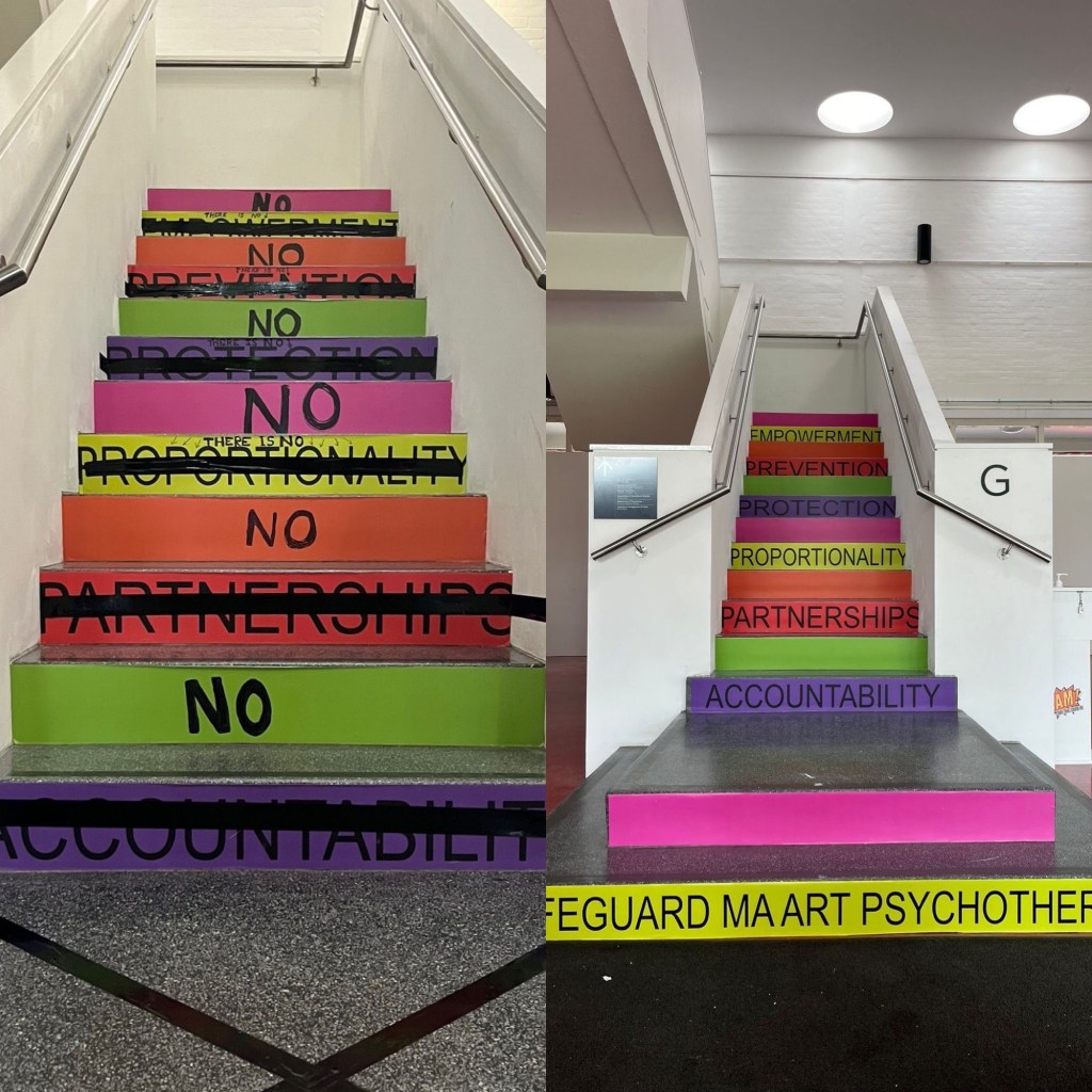I started back at uni on Tuesday, which felt very strange without half the year group. It was quite intense, especially after it appeared that our protest piece (protesting the Transformation Project) had been tampered with over the summer. The ‘Safeguard MA Art Psychotherapy’ part had been taken down, so the words we used had been effectively co-opted by the SLT. So, a few of us took to dismantling this.