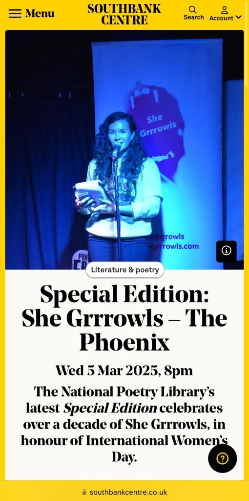 This week has been full of ups and downs. I hosted a SOLD OUT She Grrrowls at the Southbank Centre’s National Poetry Library, which is the first sold out show since the pandemic, having not been able to go back to The Poetry Cafe, not having heard anything directly from them about going back, and now being priced out of the hire fees.