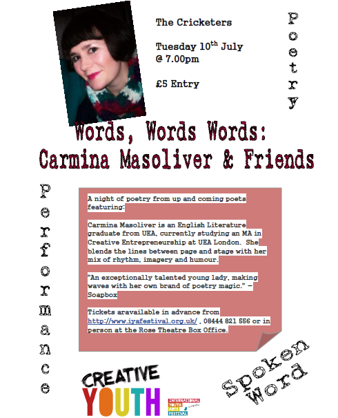 Yesterday I had the first workshop for Word’s a Stage. It was great meeting the other poets – Selina Nwulu, Anthony Hett, Errol McGlashan. We are being mentored by Malika Booker, who my Mum has banged on about since I first started reading my poetry to audiences 6 years ago (when Booker was involved in the education department at Apples & Snakes, since my Mum works at a school). She has been fantastic so far and I’m looking forward to the next session, once I’ve done my “homepleasure” in developing my character for the piece I’ve written more and re-draft it.