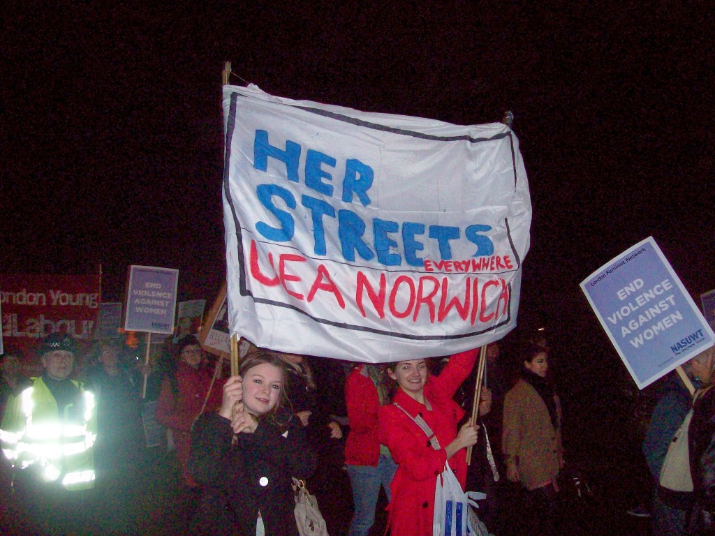 I have been working hard at Sainsbury’s and have done about 11 hours overtime, woop! It’s pretty good working there, I’m an even bigger fan of the company now, especially finding out they do a lot of funding for the arts. Also, can you believe it’s been about 11 years since Jamie Oliver started his partnership with Sainsbury’s?! That’s like, half of my life, argh! The only thing I’d like to change is to work two days and not three, and not to work Saturdays! I’m probably going to miss Million Women Rise because of it! Plus, I was late for Reclaim the Night because I finished work at the meeting time. I attempted to take the tube part of the way but ended up walking to the Camden Centre and being around half-an-hour early. I contacted the other UEA Feminist Society committee members and eventually, I heard a roar from around the corner and saw some people looking. I had found the march! I ran past two guys making gestures and spouting something nonsensical.